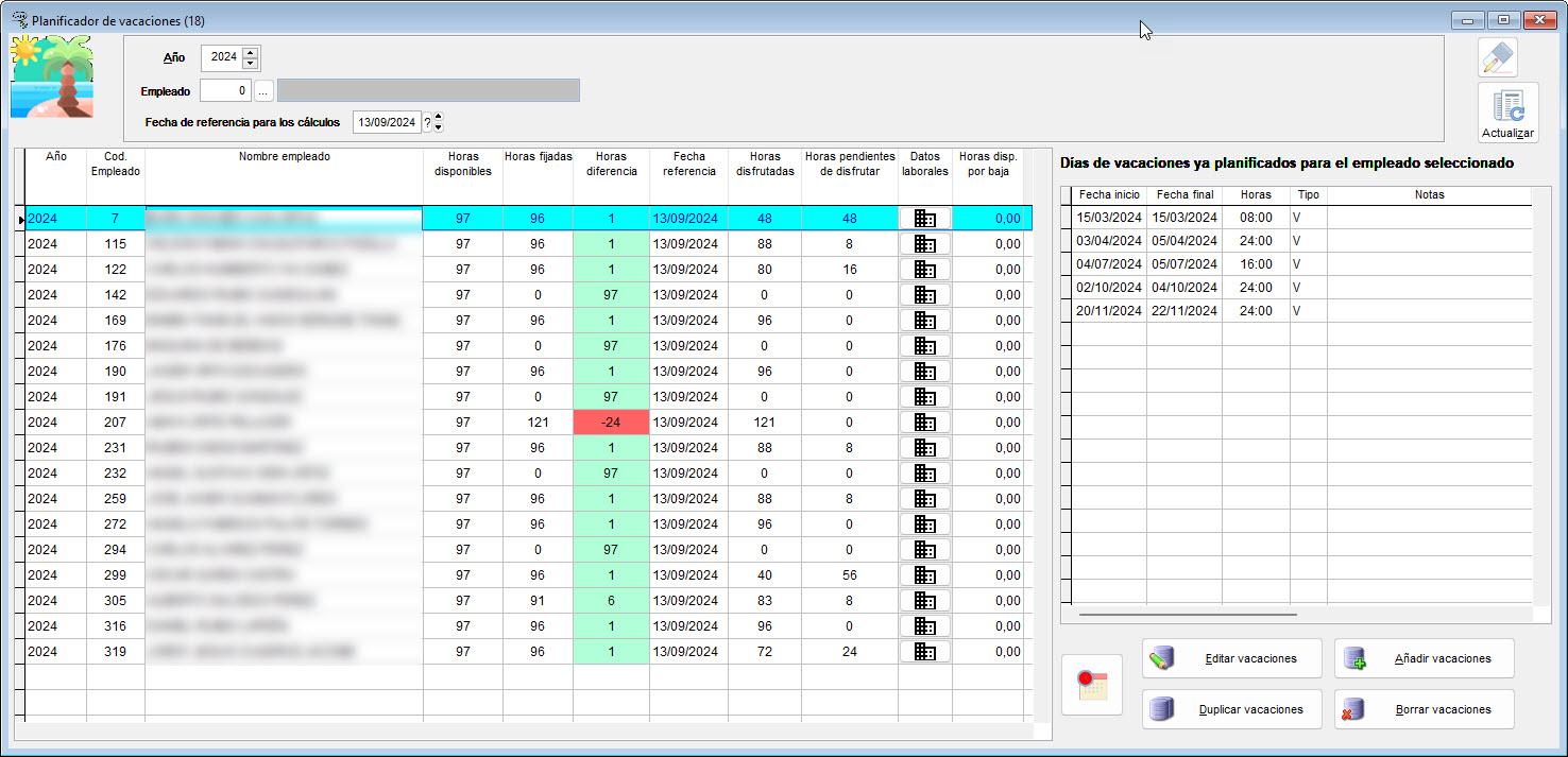 - Planificador de vacaciones. Gestione las vacaciones de los empleados con control de días disponibles, disfrutados y pendientes